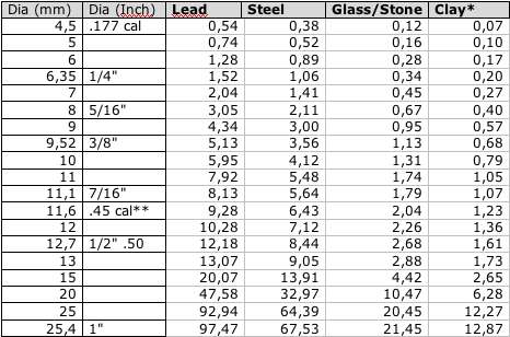 Lead has the highest density of all common materials, so a lead ball gets interesting if you need some heavy ammunition. Not surprisingly, lead balls are most popular among hunters who need every bit of power to down their quarry humanely. The relatively high price can be lowered to almost zero if a mold is used to cast ammo by yourself. Disadvantages of the lead ammo are the environmental and health problems that come along with lead, and the soft balls deform quickly when they strike a hard surface. Therefore, I recommend lead balls to hunters only, and to people who want to create extraordinary powerful slingshots. As lead is so dense, there's usually no need for calibers over .50, a cal .44 ball is considered as a very good hunting ammo.