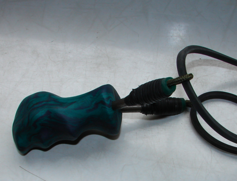 This slingshot has a contoured Fimo handle and uses the Spain-style method to attach the bands..it is basically a loop of paracord on each side, tightly wrapped with latex tubing and rubber material