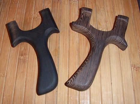 Two finger-supported, over-the-top slingshots, made of ebony and Wenge. I can tell you, the Ebony model on the left is so well polished, its a pleasure just to hold it in the hand.