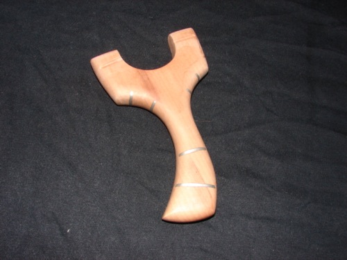 A small slingshot with metal inlays. They are made with soldering wire that is hammered into grooves. The curved handle fits the hand very well.
