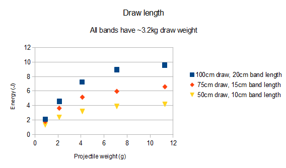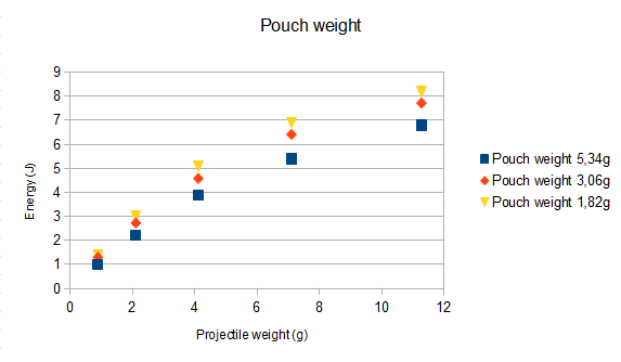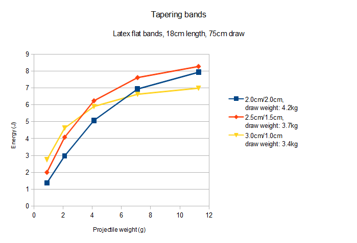 Now take a look at the graph. You see three data from slingshots using single, double and triple layered bands of the same type. When lightweight ammo is used, you get a very small difference in velocity and energy. But the gap between them increases when the ammo weight increases. You can also see that the weakest bands are significantly slower, while the double and triple bands have a very similar velocity over the whole projectile weight range- in other words, the much higher pull weight from bandset #3 is useless unless very heavy projectiles are used, while bandset #1 already struggles to propel lightweight ammunition at an acceptable speed.