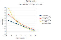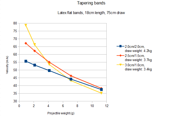A tapered band gets thinner towards the pouch side. This has profound effects on its performance. Compared to an untapered band with the same rubber mass, you have less draw weight, but can shoot the projectile at a higher velocity! As a rule of thumb, you can say that the lighter your projectile and the stronger your bands are, the higher should your tapering ratio be. The downside of tapering is its negative effect on band life, though a light tapering (in the region of 2:3) does not affect it enough to worry about.