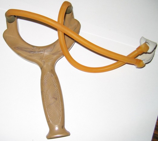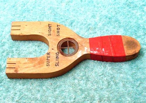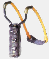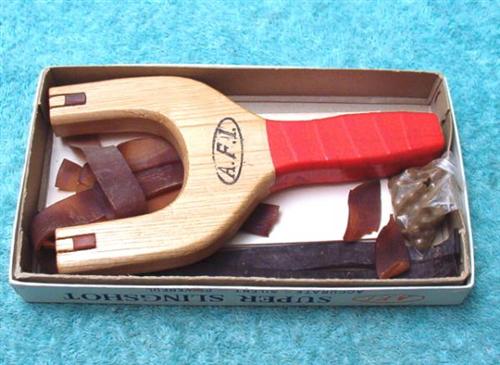 slingshot that has an internal magazine. It used dual flat gum rubber