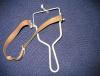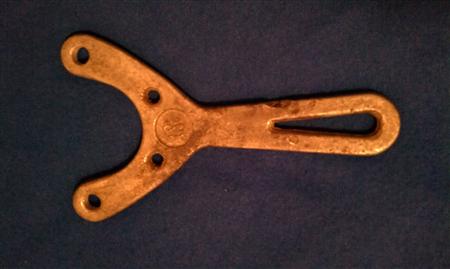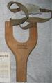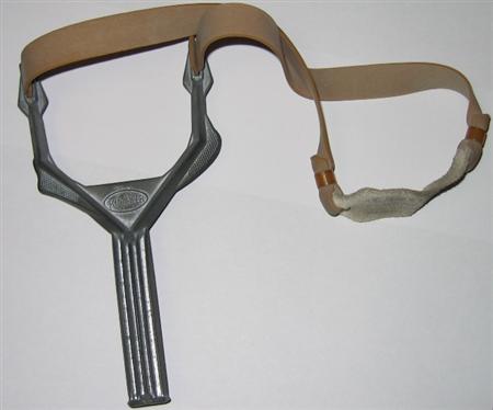 A cast metal slingshot that was made in England. The slingshot used one long rubber band that was laced through the four holes and was connected to both sides of the leather pouch, being pulled towards the shooter from the upper holes in the frame.