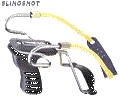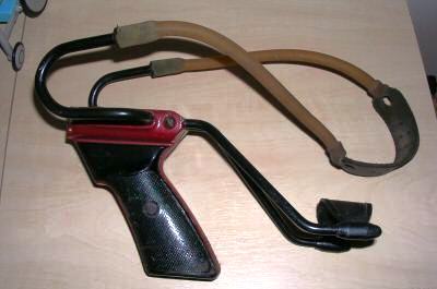The Nightstalker was sold in the 80's by "Lighthouse Marketing" from Las Vegas. It was an excessively powerful slingshot, with a fork extension and very strong bands that had a pull of about 50 lbs. Of course, the old rule that extreme designs have extreme disadvantages came into play - only very strong people could handle this slingshot, and the metal frame started to bend under the forces that rested upon it.