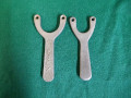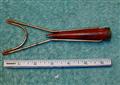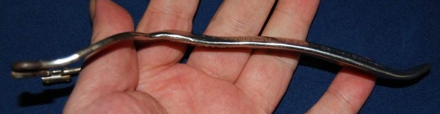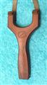 The slingshot's material is just as unusual. It appears to be forged from a flat piece of steel, like a piece of tableware. The handle is curved and recessed to fit into the hand. The exact type of band attachment is unknown, but I guess that leather loops run through the holes to connect rubber and fork.