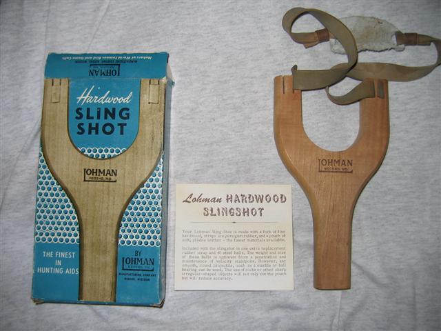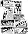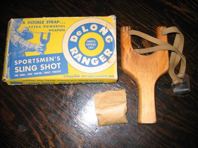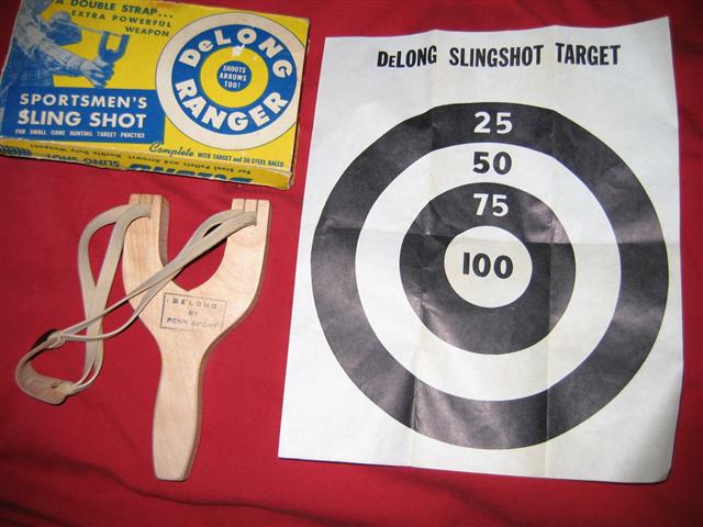 The Slingo was a simple slingshot made of bent steel wire in 1935. The cone inside the handle held BBs as ammo and could be turned upside down to release its content. With these light projectiles , crude shape and a relatively weak rubber band, this model was made for children and plinking in mind.