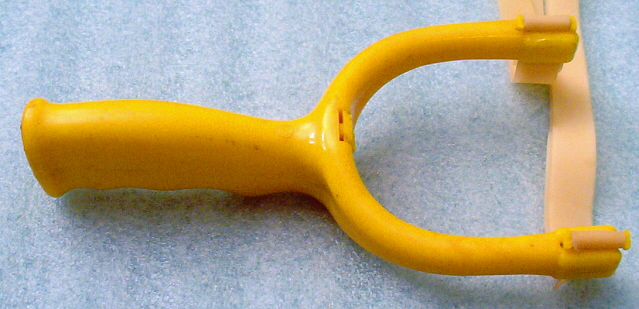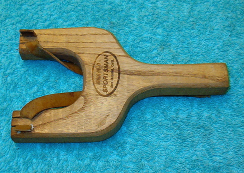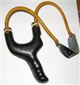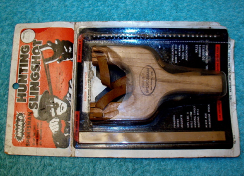 The "Blackhawk" is quite an interesting slingshot that was produced by the American Slingshot Company (ASC) from Toledo, Ohio around 1964. As you can see, it doesn't use a traditional band asembly with leather pouch, but instead has a molded cup on each side of its bands. The intention was to either load one large steel ball or fill it with shot. The Blackhawk's bands are so strong that it hurts the wrist to use it. It obvously was intended to be used for hunting, although the effect of a shot load from a slingshot is definitely not enough for this purpose.