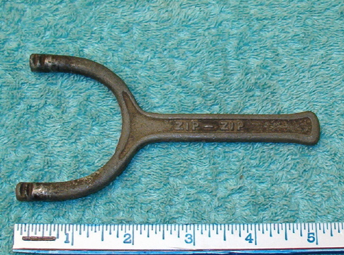 A small cast metal slingshot that appears to have used solid bands with stopping pieced molded on at the end.