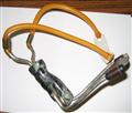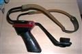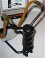 General Sports out of Lawrenceburg, Indiana produced this famous slingshot. The pistol-grip style frame is made of polished cast aluminium. The flat bands made of natural gum rubber are attached by the "match in loop"-method, the pouch is held in place by loops through holes in the bands (which is not so good for the band life). The little tube on top of the frame was meant to form a sight, so it is not intentioned to be shot in a 90 degree angle. The whole setup was sold with,according to the advertisement, "deteriorating pellets that literally explode when they hit" - probably clay ammo- and a shooting manual. The Scope-Shot proved to be a very popular slingshot back in its days.