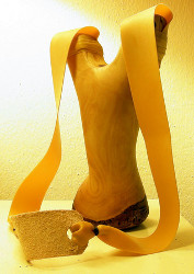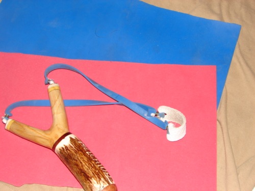 Switch to flatbands and you'll never look back. This sounds exaggerated, but is true with so many shooters! Flatbands are cut from thin (about 0.25-1mm) latex sheeting, and offer a number of unbeatable advantages: First, they have by far the highest performance. Second, it is easy to cut them exactly to the desired shape. A roll cutter is the best tool for this task. You can easily experiment with band length, width and tapering ratio until you have the perfect bandset for you. You can easily attach two or even three bands on each side of the slingshot - in fact, you often have to, as most types of latex sheeting are rather thin. Flatbands correspond very well to the "Over the top" attachmend method.