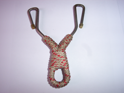 This slingshot has a contoured Fimo handle and uses the Spain-style method to attach the bands..it is basically a loop of paracord on each side, tightly wrapped with latex tubing and rubber material