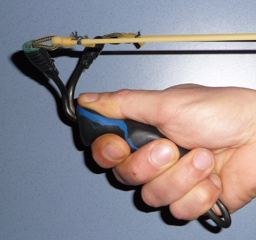 South Korea has a thriving slingshot community that is, by now, not connected with Western shooters. The Koreans have a pecuilar style of slingshots with a curved fork. The handle is supported by the thumb and the hand is bent downwards. Geko made a slingshot of this style, and says it works very well, as long as the drawing weight is kept on the low side.