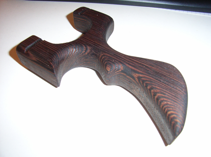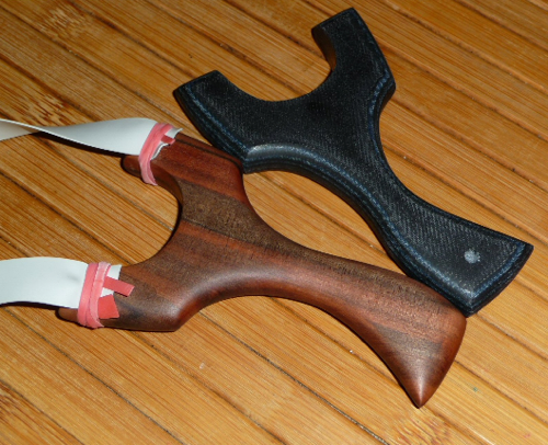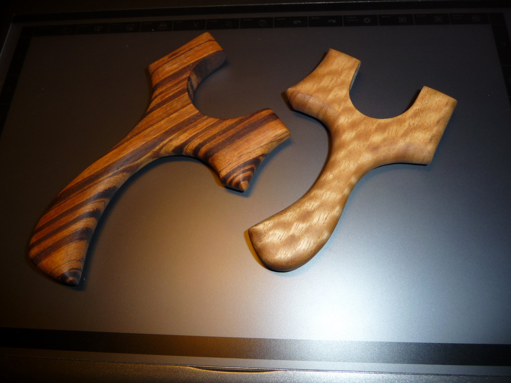 Two finger-supported, over-the-top slingshots, made of ebony and Wenge. I can tell you, the Ebony model on the left is so well polished, its a pleasure just to hold it in the hand.