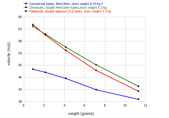 Different band shapes have a different performance. It is difficult to provide precise data on this subject, as the band's material is just as important, and one inevitable ends up comparing apples to oranges. What can be said, though, is that smaller, flexible bands with a higher surface generally have a better performance, especially with lightweight ammunition. Large tubular bands also seem to lack in performance, a possible explanation is that air is trapped inside the tubes, and causes trouble during the rapid. The graph shows three bands. One is a commercial untapered tubular band. The second one has dual small-diameter chinese-style tubular bands, while the third bandset has tapered flat bands. Please note that I'm audaciously comparing apples to oranges here, as the band have such a different draw weight, tapering, band material, and even a different extension ratio! I want to show you how much your slingshot's performance changes with different band setups.