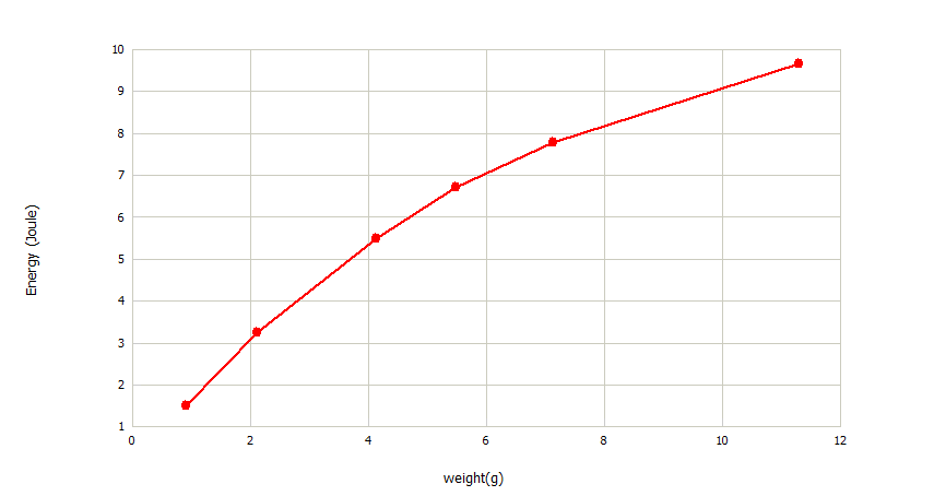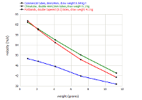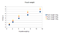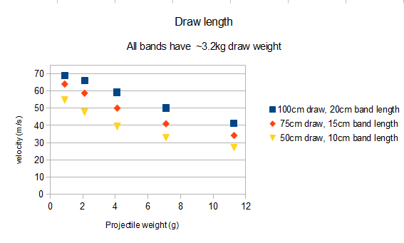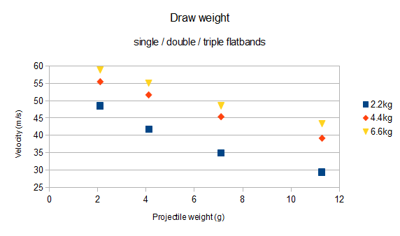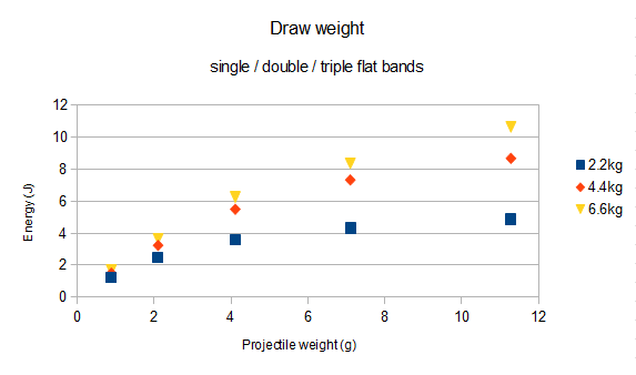 Now take a look at the graph. You see three data from slingshots using single, double and triple layered bands of the same type. When lightweight ammo is used, you get a very small difference in velocity and energy. But the gap between them increases when the ammo weight increases. You can also see that the weakest bands are significantly slower, while the double and triple bands have a very similar velocity over the whole projectile weight range- in other words, the much higher pull weight from bandset #3 is useless unless very heavy projectiles are used, while bandset #1 already struggles to propel lightweight ammunition at an acceptable speed.