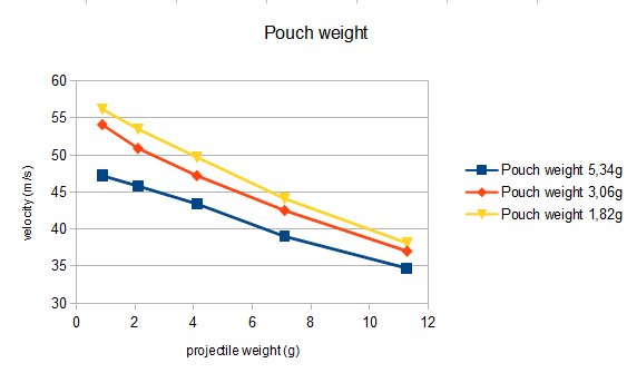 During the shot, the bands have to accelerate the combined weight of your projectile, the pouch and themselves. And the higher your pouch weight is, the more does it takes from overall energy. In reverse, you can diminish the (relative) amount of lost energy by using heavier bands or heavier ammunition.