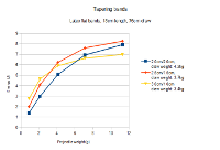 A tapered band gets thinner towards the pouch side. This has profound effects on its performance. Compared to an untapered band with the same rubber mass, you have less draw weight, but can shoot the projectile at a higher velocity! As a rule of thumb, you can say that the lighter your projectile and the stronger your bands are, the higher should your tapering ratio be. The downside of tapering is its negative effect on band life, though a light tapering (in the region of 2:3) does not affect it enough to worry about.