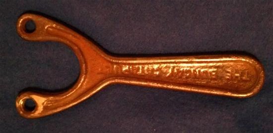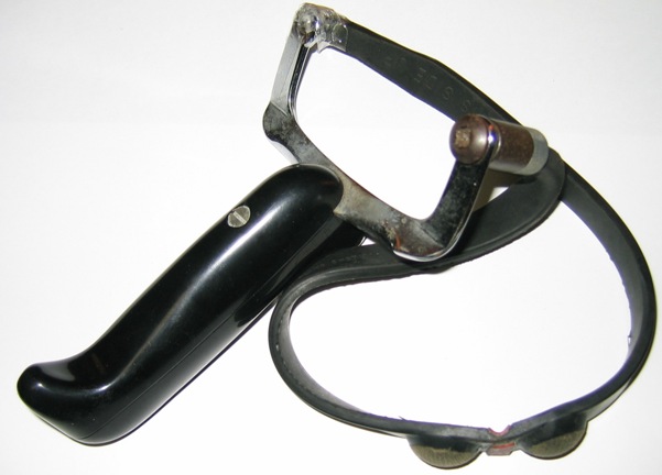 A cast metal slingshot that was made in England. The slingshot used one long rubber band that was laced through the four holes and was connected to both sides of the leather pouch, being pulled towards the shooter from the upper holes in the frame.