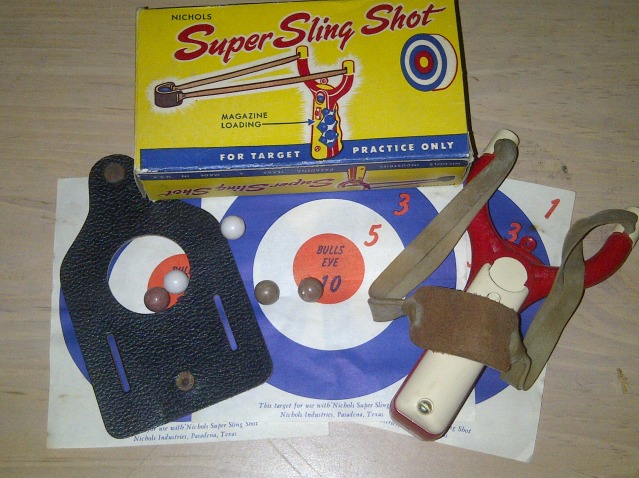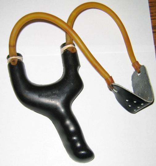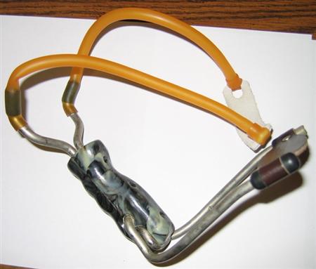 slingshot that has an internal magazine. It used dual flat gum rubber