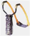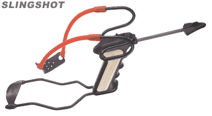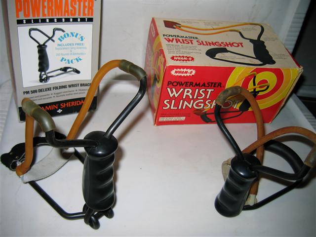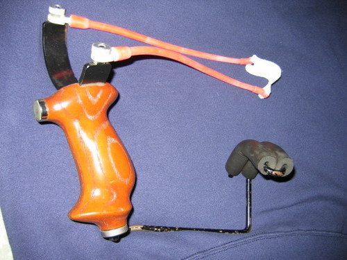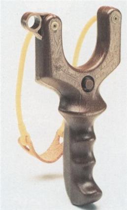 The Nightstalker was sold in the 80's by "Lighthouse Marketing" from Las Vegas. It was an excessively powerful slingshot, with a fork extension and very strong bands that had a pull of about 50 lbs. Of course, the old rule that extreme designs have extreme disadvantages came into play - only very strong people could handle this slingshot, and the metal frame started to bend under the forces that rested upon it.