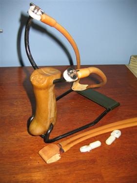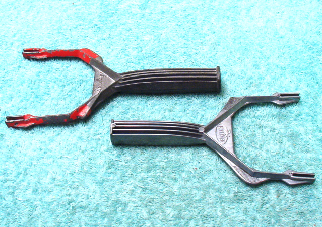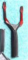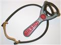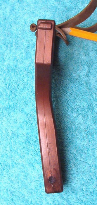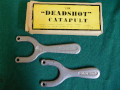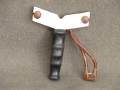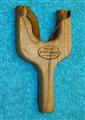 The "Blackhawk" is quite an interesting slingshot that was produced by the American Slingshot Company (ASC) from Toledo, Ohio around 1964. As you can see, it doesn't use a traditional band asembly with leather pouch, but instead has a molded cup on each side of its bands. The intention was to either load one large steel ball or fill it with shot. The Blackhawk's bands are so strong that it hurts the wrist to use it. It obvously was intended to be used for hunting, although the effect of a shot load from a slingshot is definitely not enough for this purpose.