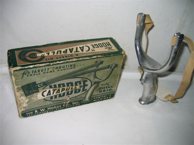 The Slingo was a simple slingshot made of bent steel wire in 1935. The cone inside the handle held BBs as ammo and could be turned upside down to release its content. With these light projectiles , crude shape and a relatively weak rubber band, this model was made for children and plinking in mind.