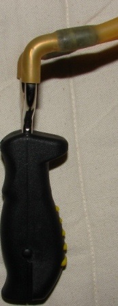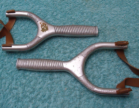 General Sports out of Lawrenceburg, Indiana produced this famous slingshot. The pistol-grip style frame is made of polished cast aluminium. The flat bands made of natural gum rubber are attached by the "match in loop"-method, the pouch is held in place by loops through holes in the bands (which is not so good for the band life). The little tube on top of the frame was meant to form a sight, so it is not intentioned to be shot in a 90 degree angle. The whole setup was sold with,according to the advertisement, "deteriorating pellets that literally explode when they hit" - probably clay ammo- and a shooting manual. The Scope-Shot proved to be a very popular slingshot back in its days.