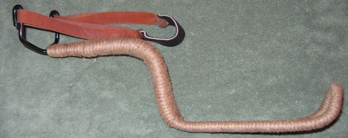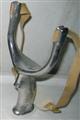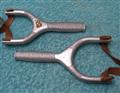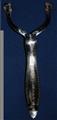 The slingshot's material is just as unusual. It appears to be forged from a flat piece of steel, like a piece of tableware. The handle is curved and recessed to fit into the hand. The exact type of band attachment is unknown, but I guess that leather loops run through the holes to connect rubber and fork.