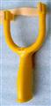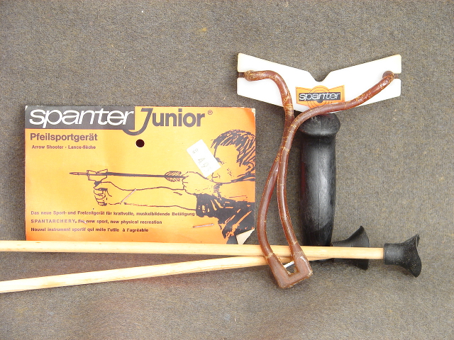 The "Spanter Junior" is a purebred arrow-shooting slingshot. Its one-piece rubber band has a small length of string molded in to hold the nock of an arrow, and the plastic fork has a notch to guide the arrow's shaft. It came with two pretty short suction-cup arrows and a paper target. Production took place in Western Germany.
