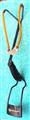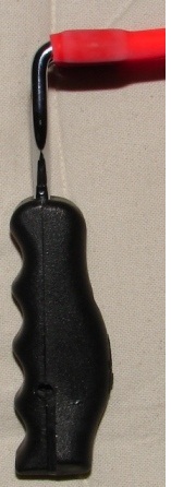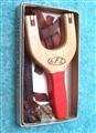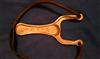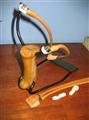 The famous Pocket-Rocket is the forefather of all wristbraced folding slingshots. The wristbrace is made of leather and the handle is some marbilized plastic, screwed to the frame which runs completely through the handle and holds the wristbrace in place. The bands are attached with the "chinese handcuff" method, while the leather pouch is attached by the "loop through itself-"way, just like it is the case with 95% of all modern slingshots. This classic has inspired almost every recent manufacturer!