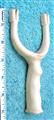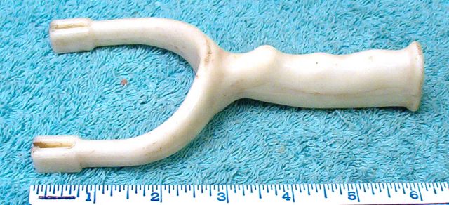 A small cast metal slingshot that appears to have used solid bands with stopping pieced molded on at the end.