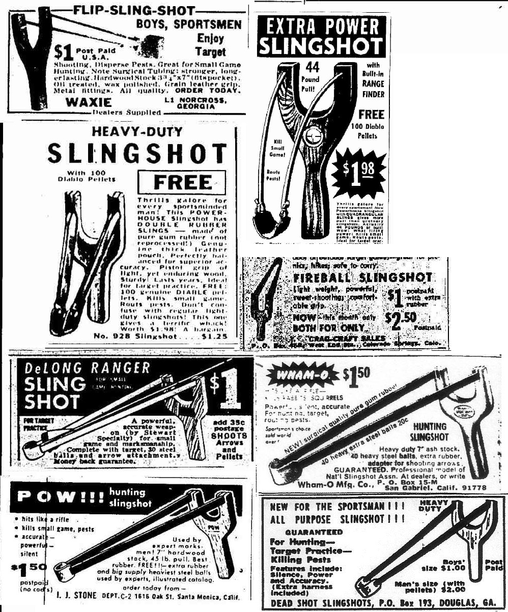 The following list is an attempt to assemble a comprehensive collection of vintage slingshots. Please note that much of the information - especially the production dates - is very vague. Finding hard data is difficult with slingshots, as they are typically produced without the documentation of, say, a car or a firearm.
